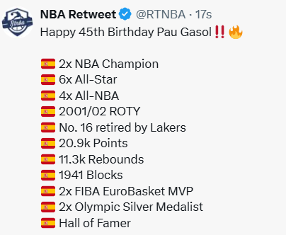 雷速体育7月6日讯 美媒NBA Retweet刚刚发布一则推文,祝贺保罗·加索尔45岁生日快乐,并罗列了他璀璨的职业生涯荣誉。